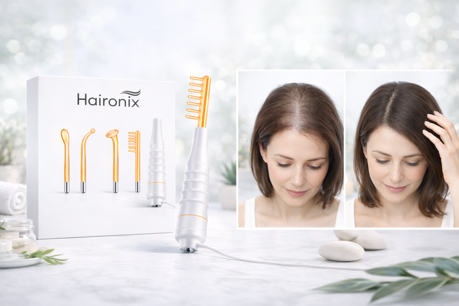 Haironix™ est un appareil de soin haute fréquence conçu pour stimuler le cuir chevelu, purifier la peau et améliorer l’apparence globale des cheveux et de l’épiderme.