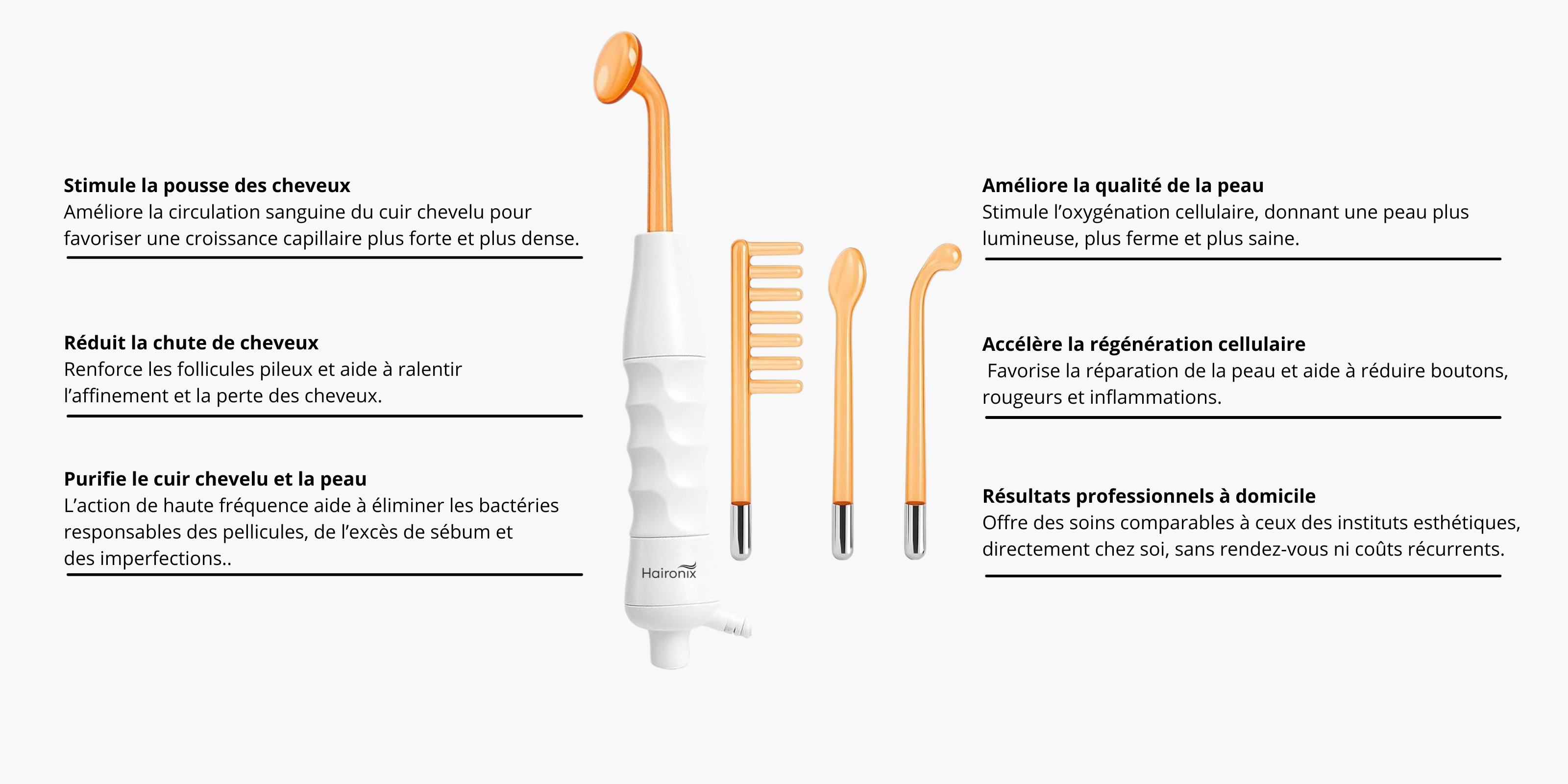 Haironix™ est un appareil de soin haute fréquence conçu pour stimuler le cuir chevelu, purifier la peau et améliorer l’apparence globale des cheveux et de l’épiderme.